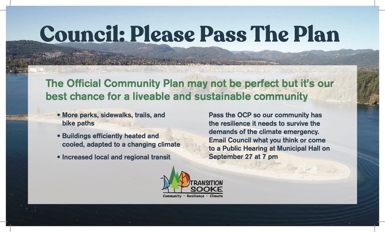 - Transition Sooke’s Official Community Plan and Climate Action Team made a presentation to Sooke Council on Monday September 14.